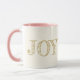 Diese Tasse hat ein mattes goldfarbenes Wort von "JOY" über weißem Hintergrund. Das Interieur ist in Rosa gehalten und der Griff ist in der Lage, die Farbe auszuwählen. Passen Sie diese Tasse an oder kaufen Sie sie wie gezeigt.