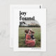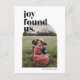Einfach und minimalistisch mit einer modernen Drehung, dieses Single Foto Urlaub Postkarte senden eine preisfreundliche Botschaft der Hoffnung mit dem Gefühl, dass "Freude gefunden uns" trotz der Herausforderungen des Lebens. Sauberes Schwarz/Weiß behalte das Motiv einfach, ein großartiges Familienfoto zu zeigen, während leicht anpassbarer Backtext lasse, eine längere Nachricht an Freunde und Familie zu senden. Das Design wird durch den Wechsel der schwarz-weißen Elemente in eine Farbe Ihrer Wahl noch individueller gestaltet.