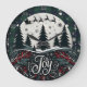This striking clock features a silhouette of Santa's sleigh and reindeer flying over a forest of dark pine trees, set against a large white moon and a green and blue plaid sky. The bottom half is richly decorated with detailed holly, berries, and pine boughs, centered around the ornate white script word "Joy." The design provides a sophisticated, stylized Christmas look. The design may look real due to the high detail and three-dimensional texture in the artwork.