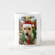 Digitales Kunstgemälde eines jungen Weihnachtsjunges mit Kranz, Weihnachtsmannmütze und dekoriertem Baum.