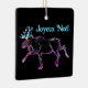 Eine helle, neonähnliche Darstellung eines Bullenmoose auf schwarzem Hintergrund. Französischer Text, "Joyeux Noё l" erscheint in leuchtend blau und weiß.