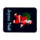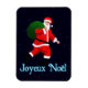 Glaubst du an den Weihnachtsmann? Ein Bild eines beeindruckenden Weihnachtsmannes (Père Noël), der eine grüne Tüte Geschenke trägt, überlagert auf einem sternenförmigen Hintergrund. Französischer Text mit dem Text "Joyeux Noё l" erscheint in leuchtendem Blau und Weiß.