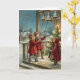 Imagine a lovely vintage picture showing a snowy Christmas scene with three kids on a cozy porch, all caught up in holiday fun. Two boys in bright red coats and hats ring silver bells while looking up in wonder at falling snowflakes against the evening sky. Their colorful outfits really pop in the peaceful winter setting.