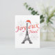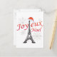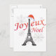 Joyeux Weihnachten mit einem Foto des Eiffelturms mit einem Hut aus dem Weihnachtsmann und Schneefall.