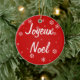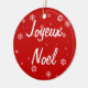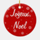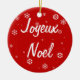 Ein Ornament mit rotem Hintergrund, weiße Schneeflocken und Joyeux Weihnachten.