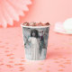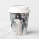 Eine Vintage französische Weihnachtspostkarte aus dem öffentlichen Bereich. Es zeigt ein Mädchen, das als Weihnachtsengel gekleidet ist und Geschenke trägt.