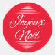 Joyeux Weihnachten rund Aufkleber . Es zeigt ein extravagantes Typografie-Design von Alma Wad . Französische Weihnachtswünsche in eleganten Schriftart in Weiß gegen Rot .