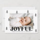 Festliche Weihnachtskarte aus dem Foto, umgeben von schwarzen, von Hand gezeichnet Kiefern mit schwarzem Hintergrund. "Joyful" wird in fett gedruckter schwarzer Schrift mit Ihrem persönlichen Gruß und Familiennamen angezeigt, wie unten gezeigt. Die fröhliche Weihnachtskarte kehrt um, um ein zusätzliches Foto und einen schwarzen Hintergrund mit subtilen weißen Punkten anzuzeigen.