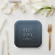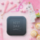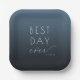 This elegant wedding plate features a minimalist design with a gradient blue background, transitioning from deep navy to a lighter shade. The phrase "BEST DAY ever" is prominently displayed in a mix of bold sans-serif and cursive fonts, creating a modern yet sophisticated look. The clean layout and serene color palette evoke feelings of joy and celebration, making it perfect for commemorating your special day. Ideal for adding a personal touch to your wedding reception, this plate combines style and sentiment seamlessly.