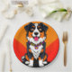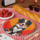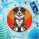 Charmante Abbildung eines fröhlichen Hundes-Gesichts, zentriert auf einem fett orangefarbenen Hintergrund, mit lebendigen Farben und einem lustigen, Cartoon-Stil.