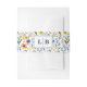 This wedding invitation belly band features a vibrant floral pattern with clusters of colorful flowers in shades of orange, purple, blue, and green set against a white background. The design showcases a whimsical and cheerful style, reminiscent of a meadow or garden scene, using a digital illustration technique with a watercolor texture for a soft, blended appearance. At the center, bold serif initials "L" and "B" are framed within a square, adding a personalized touch to this joyful and lively design perfect for celebrating love and nature.