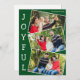 Moderne grüne Weihnachtskollage-Karte mit 3 Familienfotos in einem lustigen überlappenden Schnappschuss-Muster mit weißem Rahmen und dem Wort Freude, das vertikal auf der Seite geschrieben wurde. Finden Sie Ihre drei Lieblingsbilder für diese niedliche Familienurlaubskarte.
