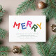 Step into a world of minimalist charm and vibrant joy with this delightful holiday design featuring your party details alongside colorful bold letters that spell out the word "Merry" using playful typography.