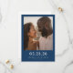 This wedding save the date features a romantic and intimate photograph of two individuals, set against a deep navy blue background that enhances the warmth of the image. The layout is clean and vertically oriented, with ample negative space to emphasize the subjects. Elegant serif typography highlights the date and names at the bottom, creating a focal point while maintaining a balanced composition. The design captures a candid moment of joy and connection, making it perfect for announcing an upcoming celebration.