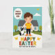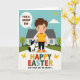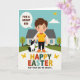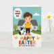 Designed with a bright spring scene, the illustration centers on a smiling young figure with rosy cheeks walking beside a black-and-white dog that looks up with an affectionate gaze, like two close friends sharing a quiet moment. A softly curving path leads them toward a small, stylized house tucked among green bushes and leafy trees, with a few 🌷 touches suggested in the garden. Above, a clear blue sky holds one puffy white cloud while a few tiny golden-winged insects drift near the top, adding light motion. Near the figure’s head, a rounded speech bubble carries a short encouraging line in dark lettering against a pale fill. Along the bottom, a large Easter greeting stretches across the width in big letters, each character in a different color for a cheerful rhythm, with a small 🐰 accent nearby. The open spacing keeps the characters easy to spot, while the dog’s tilted head and the figure’s gentle smile create a soft, caring connection. The house sits slightly back from the path, with a simple roofline and a front door framed by greenery. In the background, rolling green shapes layer behind the house, and the pathway narrows as it curves into the distance.