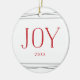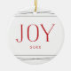 Eleganter und moderner Weihnachtsschmuck mit einem knusprigen weißen Hintergrund mit "JOY" und das Jahr in lebhaftem Urlaubsrot, gerahmt von dünnen, knusprigen schwarzen Bändern für einen schicken geometrischen Look. Fügen Sie der Rückseite ein beliebtes Foto hinzu, um einen schönen Urlaubssinn zu genießen.