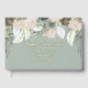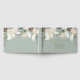 Ein wunderschönes Gästebuch mit Goldfolie und einem cremefarbenen Rahmen auf Salbeihintergrund. Text ist ein großer glücklicher Jubiläum; "Willkommen zu unserem Feiern", dann Braut und Bräutigam Namen.