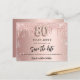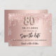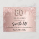 Ein Save the Date für eine 80. Geburtstagsfeier. Rose goldener Hintergrund mit Rose Gold und Imitate silberne Glitzer Tropfen. Personalisieren und fügen Sie Datum und Namen/Text hinzu. Der Text: Save the Date wird mit einem großen angesagten, handgeschriebenen Stilskript mit Swashes geschrieben. Nummer 80 mit einem Schriftart im Ballonstil.