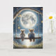 Junge und junge Teddybären sitzen auf einem Holzschwung und blicken auf einen großen, hellen Mond über einen ruhigen Gewässer. Der Text kann geändert werden.