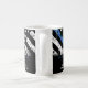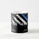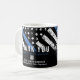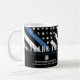 Dieses Design verfügt über eine Polizeiflagge mit schwarz-weißen Streifen und einen dünnen blauen Streifen. Diese Tasse ist ideal, um einem Offizier, der ein Jubiläum feiert, Anerkennung zu zollen oder einem pensionierten Strafverfolgungsbeamten, Sheriff, Kapitän oder Chef für ihre Dienstjahre zu danken.
