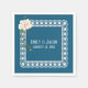 Eleganter, quadratischer, weißer Spitzenrahmen mit weißem Hydrangea-Brautbukett auf blauem Hintergrund. Für ein Hochzeitstag Party oder Hochzeit Vow Renewal Empfang. Text ist bearbeitbar.