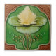 Das ist eine wunderschöne Jugendstil-Wasserlililie-Kachel, die aus unserer persönlichen Sammlung stammt. (Besonders schön sind die Wasserblasen im Design.) Die Kachel ist mit einer oft pfirsichfarbenen Elfenbein-Blume und Grüntönen gerahmt durch eine Ton- und Terrakotta-Grenze versehen. Die Kachel sieht so dreidimensional aus wie das Original, aber diese in einem Relief von Imitaten oder Trompe l'oeil ("Narr das Auge") Stil gedruckt, der alle geschnitzten Details des Originals auf einer glatten flachen Kachel einfängt. Schön genug, um an einer Wand zu hängen, als Wandfliesen, Trivet, Untersetzer zu verwenden oder es als Kunstobjekt auf einem kleinen Areal zu platzieren. Auch macht große Akzent-Fliesen für Backsplashes, Tischplatten und ähnliche Projekte. Brauchen Sie Ideen? Auch auf den Treppenaufgängen sehen die Fliesen gut aus! Erhältlich in 4,5- und 6-Zoll-Fliesen sowie anderen Artikeln.