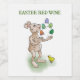 Der Osterhase jongliert die Ostereier, während das kleine Huhn das Publikum ist.