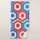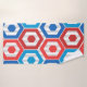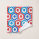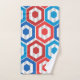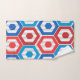 Dieses Handtuch Set hat eine geometrische Konstruktion von Hexagonen in rot und blau auf einem Feld von Streifen in zwei Grautönen.