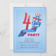 Beginnen Sie Ihren Unabhängigkeitstag mit diesen festlichen Einladungen. Der blaue Hintergrund beherbergt eine große Zahl 4, den Hut von Onkel Sam und ein wackelndes Band, in dem "Unabhängigkeitstag" steht.