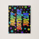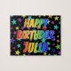 This lively, vibrierend, birthday-themed jigsaw puzzle design feature the message "HAPPY BIRTHDAY, JULIA" with the characters having a colorful rainbow spectrum inspiriert gradient pattern, along with a fun field of stars background pattern. A colorful puzzle like this might be a fun way to acknowledge the birthday of somebody named Julia. [~ Z0000468]