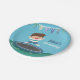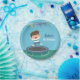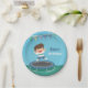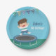 Personalisierte Partyversorgungen des PapierTellers für eine Trampoline oder themed ein Geburtstags-Party des Spielplatzes! Er hat einen niedlichen kleinen Jungen, auf eine Trampoline vergnügt aufzuprallen. Flaggenflaggen in den verschiedenen Mustern mögen Polkapunkte, Streifen, Sterne und Zickzack hängen im Hintergrund. Farbpalette der Blues und der Grüntöne macht dieses groß für Geburtstagsjungen! Fügen Sie Ihre Partymitteilung in den bereitgestellten Schablonentexten hinzu.