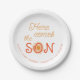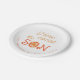 Helle Orangensonne hier kommt die Sohn-Mutter, die Baby Dusche personalisierte Papierpresse Teller nennen soll