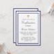 Eine moderne, elegante und bestätigte Einladung. Weiß mit königsblauen Rahmen und goldenem Kreuz. Personalisieren und fügen Sie einen Namen und Details. Schwarze Buchstaben.