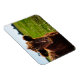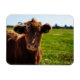 Mit einer jungen, verschwommenen braunen Kuh, die auf dem Bauernhof auf einem Feld herumhängt. Bei solch schönem Wetter wäre es schade gewesen, dieses niedliche nahe Foto nicht einzufangen.