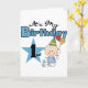 T - Shirt, Körperanzüge, Karten, Aufkleber, Magnete, Taschen und andere Erstgeburtstage-Kleidung und Geschenke mit einem kleinen Jungen in einem blauen Windel- und Party-Hut, einem großen Stern und Ballons!