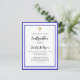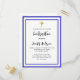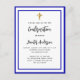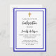Eine moderne, elegante und bestätigte Einladung. Weiß mit königsblauen Rahmen und goldenem Kreuz. Personalisieren und fügen Sie einen Namen und Details. Schwarze Buchstaben.