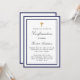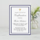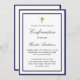 Eine moderne, elegante und bestätigte Einladung. Weiß mit königsblauen Rahmen und goldenem Kreuz. Personalisieren und fügen Sie einen Namen und Details. Schwarze Buchstaben.