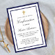 Eine moderne, elegante und bestätigte Einladung. Weiß mit königsblauen Rahmen und goldenem Kreuz. Personalisieren und fügen Sie einen Namen und Details. Schwarze Buchstaben.