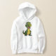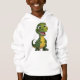 Jungs Hoodie mit einem fröhlichen Cartoon Dinosaurier stehend aufrecht, zeigt ein breites, freundliches Grinsen mit großen Augen, die zu seinem spielerischen Aussehen beitragen. Der grüne Körper und der gelbe Bauch kontrastieren sanft, während sich kleine Spitzen auf den Rücken reihen.