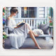 Eine junge Frau in einem fließenden weißen Kleid sitzt auf einer Veranda und liest ein Buch mit einer weißen Katze, die neben ihr ruht
