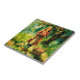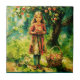 Keramik Kachel in einem Aquarellporträt eines jungen Mädchens in einem roten Kleid, stehend in einem Obstgarten, mit einem Korb von Äpfeln. Um sie herum sind reife Äpfel auf dem Boden und hängen von Bäumen. Die Szene ruft Wärme, Unschuld und die Schönheit der Natur hervor.