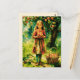 Postkarte im Aquarellbild eines jungen Mädchens in einem roten Kleid, das in einem Obstgarten stehend ist und einen Korb mit Äpfeln hält. Um sie herum sind reife Äpfel auf dem Boden und hängen von Bäumen. Die Szene ruft Wärme, Unschuld und die Schönheit der Natur hervor.