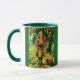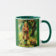Tasse im Aquarellbild eines jungen Mädchens in einem roten Kleid, das in einem Obstgarten stehend ist und einen Korb mit Äpfeln hält. Um sie herum sind reife Äpfel auf dem Boden und hängen von Bäumen. Die Szene ruft Wärme, Unschuld und die Schönheit der Natur hervor.