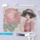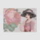Junge Viktorianische Frau mit verziertem dunkelrosa Blume Kleid und großem Hut mit großen rosa und rote Rosen im Hintergrund Gewebe Papier für Geschenkartikel und/oder entweihende Projekte.
