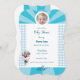 Fröhliche Babydusche mit weißer und blauer Farbe. Mit einem fliegenden Baby überzogen, das in Ballons getragen wurde. Ein schöner Sake des schönsten Ereignisses
