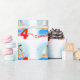 Geburtstags-Packpapier, das wenig hölzernes Boot mit Segel und Flagge an einem windigen Tag in Meer in Blauem und in Rotem kennzeichnet. Personifizieren Sie dieses vierte Geburtstagspapier der wunderlichen Jungen mit Ihrem Namen und Alter. Liest z.Z. Connor 4 heute. Einzigartig gemalt im Aquarell und durch Sarah Trett entworfen.