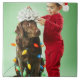Junger Junge, der Weihnachtslichter um einen Hund Fliese