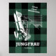 Ein originelles Bergposter für die Jungfrau 4158 m in den Berner Alpen in der Schweiz, Europa. Der Text Climb jeden Berg bezieht sich auf das berühmte Lied aus dem Film The Sound of Music. Das Bild repräsentiert ein Paar Ski, einen Rucksack, einen alpinistischen Pick und ein Rehe - alles Zubehör, das für den Alpinismus benötigt wird. Der Hintergrund wird mit einem waldgrünen Büffel karierten Muster erstellt. Eine tolle Geschenkidee für jeden Skifahrer, Wanderer, Bergsteiger, Bergsteiger, Abenteurer, der den Jungfrau Gipfel war oder will.