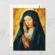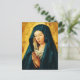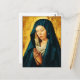 Der schlichte und dunkle Hintergrund kontrastiert mit dem strahlenden Kopf der Jungfrau und der weißen Kopfbedeckung, und ihre Hände sind sanft zusammengeschlossen