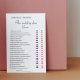 Shoe Game für eine Hochzeitsdusche oder eine Paardusche mit Schwarzweiß-Karten, die auf die Namen der Braut und des Bräutigams zugeschnitten sind. Alle Fragen im lustigen Bordeaux-Brautparty-Spiel, Bachelorette und Hochzeitsschuh sind veränderbar.